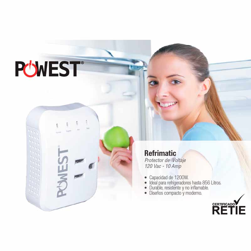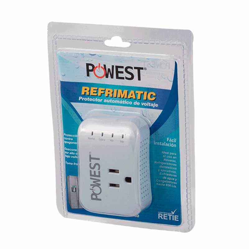 Los protectores de voltaje Powest Refrimatic están diseñado para proteger sus equipos de refrigeración como neveras y nevecones en capacidades hasta de 800 Litros, protección de voltaje desconexión por alto y bajo voltaje, ciclo de espera de 4 minutos toma de salida nema 5-15r.