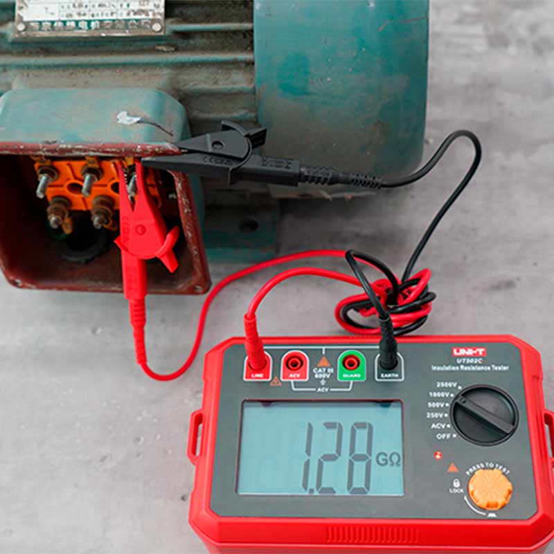• Pruebas de Motores Eléctricos: Evaluación del aislamiento en motores para asegurar un funcionamiento seguro.